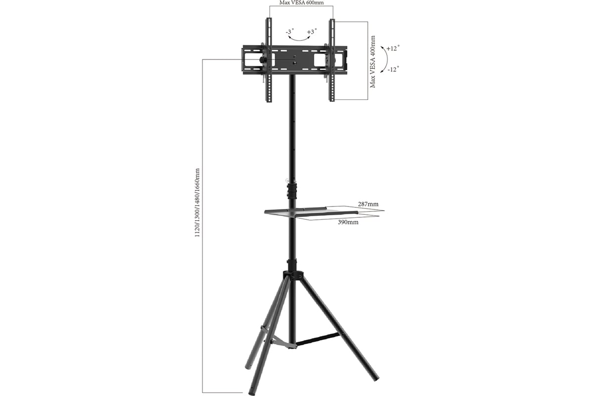 Мобильная стойка Arm media TR-STAND-2 black 10247 идеально подойдет как для офиса, чтобы проводить презентации, так и для дома. Высота штатива регулируется 1120 до 1660 мм. Стойку при необходимости можно перемещать в любую точку помещения. В конструкции предусмотрен кабель-канал. Модель отличается современным технологичным дизайном. Максимальный размер телевизора 70 дюймов.