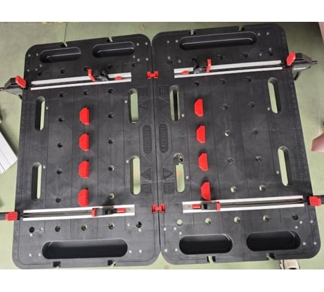 Поскольку работать предполагаетсяпо возможности на улице и с метровыми заготовками, приобрёл сразу два складывающихся стола. Они хорошо собираются вместе как вдоль, так и поперёк. Фиксаторы столов чисто символические. Все размеры отличаются от заявленных. Например: столешница 860х540 высота 800. Отверстия под упоры 19,5. В комплекте 4 одинаковых упора. Зачем-то снизу столешницы имеются 2 колёсика для перевозки. Что там возить 13 кг?