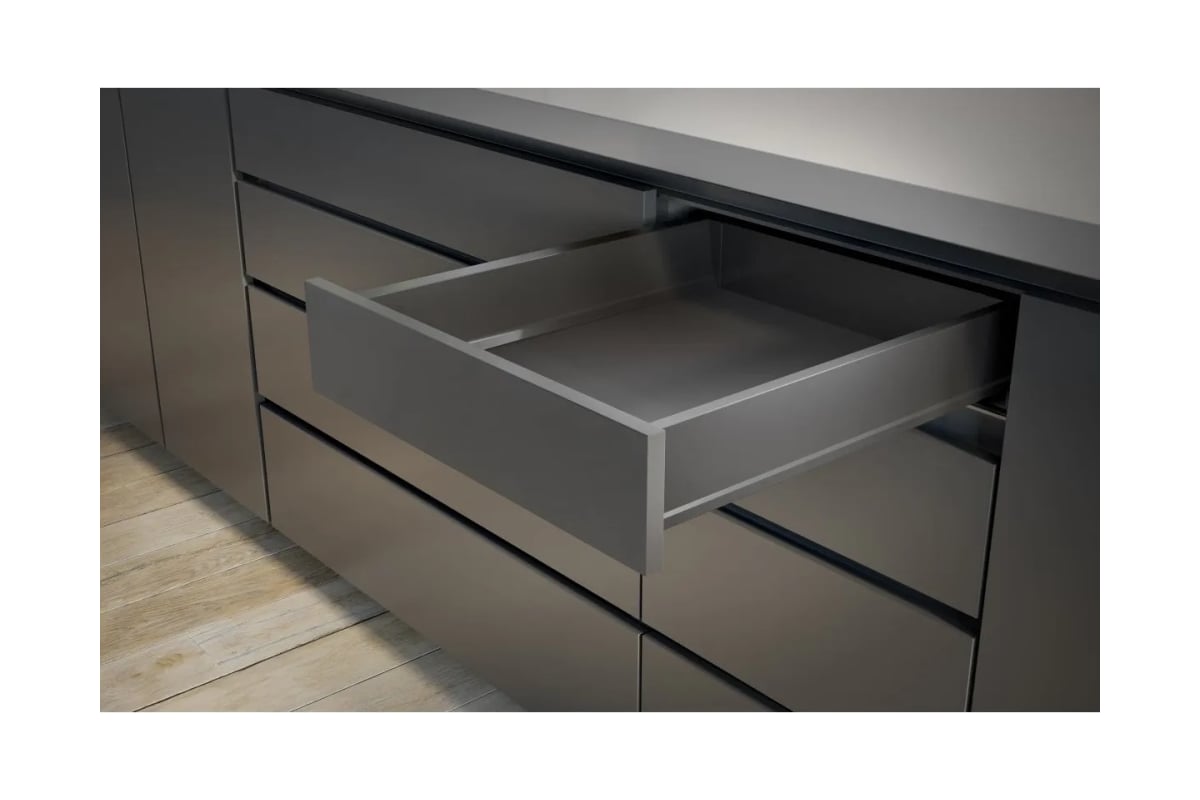Модерн Бокс PRO L-500, низкий H-84 мм, антрацит - мебельная система выдвижения, представляющая собой набор из направляющих, боковых стенок и рейлингов, для сборки выкатного ящика. Модерн Бокс в первую очередь предназначен для кухонных гарнитуров, но также может быть использован в мебельных конструкциях другого назначения, где конструктивно предусмотрены выдвижные ящики.
