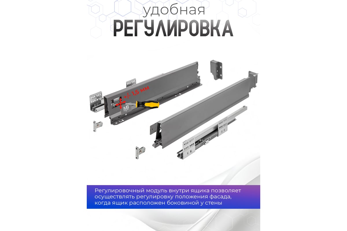 - Функциональные элементы, используемые для регулировки, расположены на внутренней стороне боковины, то есть внутри ящика Таким образом легче осуществлять регулировку, когда ящик расположен боковиной у стены