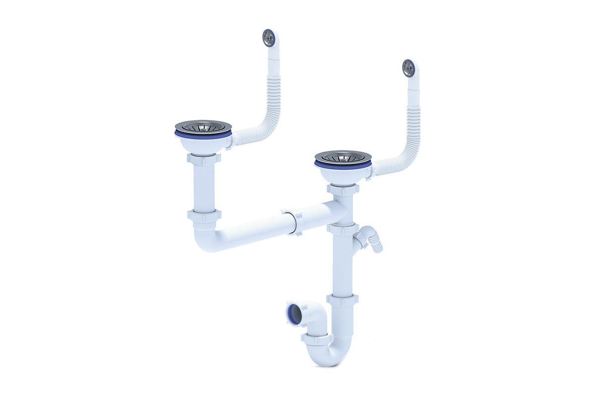 - Отводная арматура с выпуском для двух разноуровневых чаш 3 1/2" (D=90 мм) с переливом.