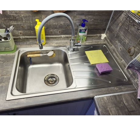 Неплохая мойка. Толстый металл, шумоизоляция. В стол 80 см встала впритык. Из-за этого штатный крепеж получилось использовать не везде. Можно было бы сделать мойку чуть шире, а площадку сбоку уже. Снаружи какое-то матовое покрытие, которое царапается( жена закатывала банки), но лечится 2000 наждачной бумагой. Цена завышена.