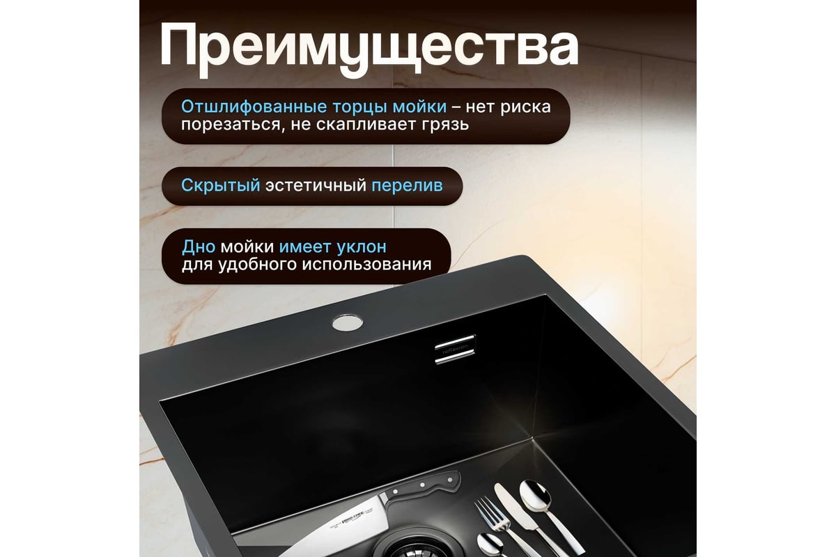 Мойка не вытарчивает над столешницей, что исключает риск получения травм при использовании мойки. В случае, если необходимо нивелировать небольшую кривизну столешницы, мойку легко можно притянуть к столешнице набором крепежа, входящим в комплект поставки.