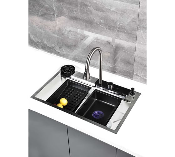Многофункциональная кухонная мойка ПрофСан ПСМ сочетает стильный дизайн, практичность и передовые технологические решения. Поверхность врезной мойки для кухни легко очищается, не задерживает запахи и характеризуется отличной износоустойчивостью. Температуру воды можно регулировать с помощью поворотной ручки (прогрессивный картридж). Встроенный LED-дисплей отображает текущие показатели температуры воды, работая без подключения к электросети. Смеситель с гибким изливом предлагает три режима подачи воды, которые удобно переключаются нажатием кнопки. Выдвижная лейка длиной до 50 см и излив, поворачивающийся на 360°, делают процесс мытья посуды максимально комфортным. Мойка оснащена шумоизоляцией. В комплект входят дозатор для моющих средств без емкости (длинная силиконовая трубка и силиконовая крышка позволяют использовать широкий выбор емкостей размещая их в шкафу под мойкой, благодаря чему замена моющего средства становится очень простым мероприятием, так же в комплекте дополнительная съёмная чаша, коландер, деревянная разделочная доска и увеличенный мусоросборник выпуска. Благодаря конструкции с направляющими, Вы сможете настроить чашу и коландер под конкретные задачи: полоскание, замачивание посуды, её сушку или обработку продуктов. Надежная и крепкая конструкция позволяет дополнительно установить измельчитель пищевых отходов.