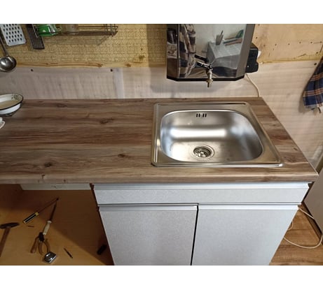 Как мойка - все хорошо. Матовая, из толстой нержавейки, глубокая. На дне есть виброизол. Отсутствие отверстия под смеситель скорее плюс - просверлить недолго, а кому то и может быть ненужным это отверстие. Даже наклейку на выпуск приклеили "Не порежьтесь - острые кромки." Только производителю следовало бы сначала ее врезать по своим чертежам, а то что-то не то выходит. И да, тут есть квадратный перелив. Для ее врезки потребуется пилка ПРАКТИКА 244-384 арт 15740268 для радиальных элементов, пилка Gigant G-11222 арт 27967046 для прямых элементов и лобзик Фиолент ПМ5-720Э арт 15489443. Для герметизации и дополнительной проклейки использовали SOUDAL Фикс Алл Кристал прозрачный 119130 арт 15863626 (но есть минус что немного желтеет, лучше брать другой SMX герметик, но с герметизацией справляется). После вырезки столешницу пропитали водостойким ПВА клеем и алюминиевым скотчем. В идеале можно после ПВА пройтись герметиком, но так как мойку монтировали с прокладкой и на герметик по контуру сложно представить что под нее что-то затечет. Ну и сифон Сифон для мойки Unicorn арт 32154576 так как 90мм не бывает. Все есть тут же.