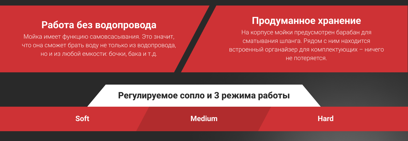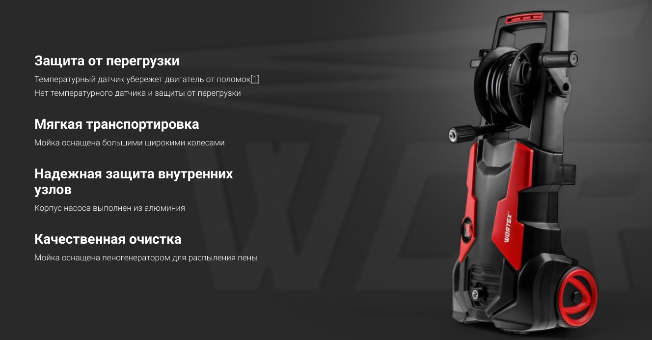 Отличный напор и давление воды. Есть пистолет для пены в комплекте, не надо докупать ничего - достал и пользуешься.
