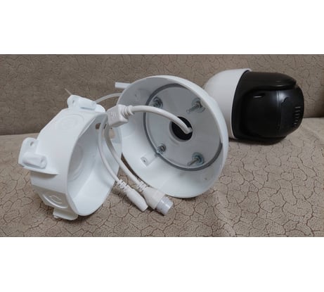 Коробка состоит из внутренней и внешней частей. Сначала к стене прикручивается внутренняя часть, затем на нее прикручивается внешняя часть с уже смонтированной камерой. На внешней части есть разметка для монтажа камеры. Выступающий бортик кольца на внешней части коробки обрезать не надо, он нужен для предотвращения затекания воды в щель между корпусом коробки и площадкой камеры. После того как прикрутили камеру саморезами, они будут торчать внутри коробки и могут повредить кабели внутри коробки, поэтому на эти саморезы я просто навернул дюбеля, которые шли в комплекте с камерой. После окончательной сборки вся конструкция выглядит вполне надежно.