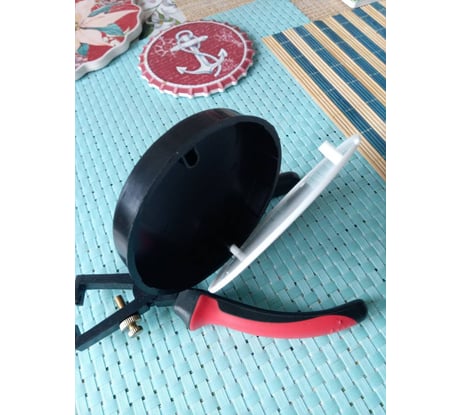 Не толстая около 17 мм толщины в сборе, глубина около 14 мм, при этом значительный диаметр, около 114 мм в сборе по крышке, внутренняя часть по наружному диаметру около 94 мм, а внутренний диаметр 91-93 мм. Можно нормально разместить провода. Буду использовать как настенную в деревне. Если не очень хорошо закрывается крышка, можно сделать как на приведенной ниже фотографии, вставить в крышку в отверстия кусочки от спички, закрываться начнет лучше.