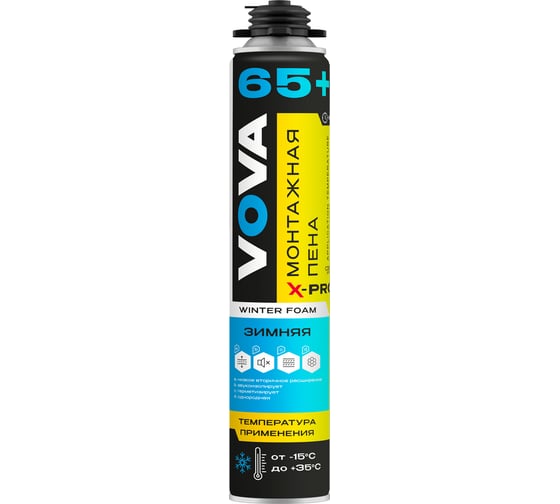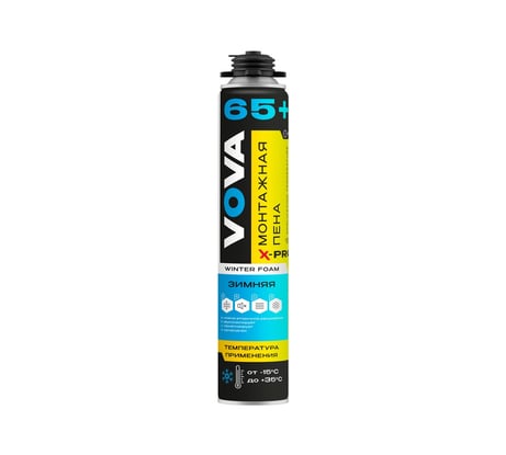 VOVA X-PRO 65 литров 850 мл - Пена полиуретановая монтажная профессиональная ЗИМНЯЯ с увеличенным выходом. Используется при температуре от -15 С до +35 С. Подходит для выполнения широкого спектра строительных и ремонтных задач как снаружи, так и внутри помещения. Обеспечивает высокую адгезию к большинству материалов, превосходную термо и звукоизоляцию.