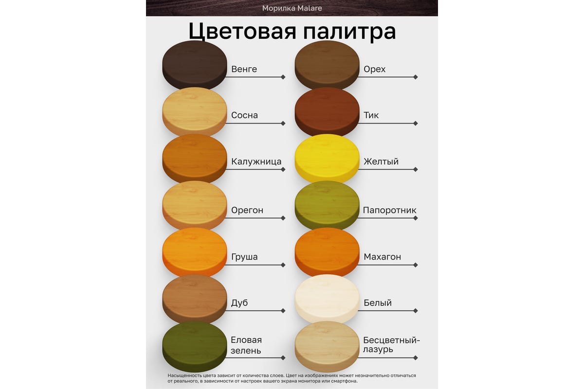 Морилка для дерева MALARE Professional - это специализированный лакокрасочный материал на акриловой основе, который объединяет в себе лучшие свойства лака и пропитки, но в то же время не перекрывает натуральный рисунок дерева, а подчёркивает его и делает более контрастным и фактурным.