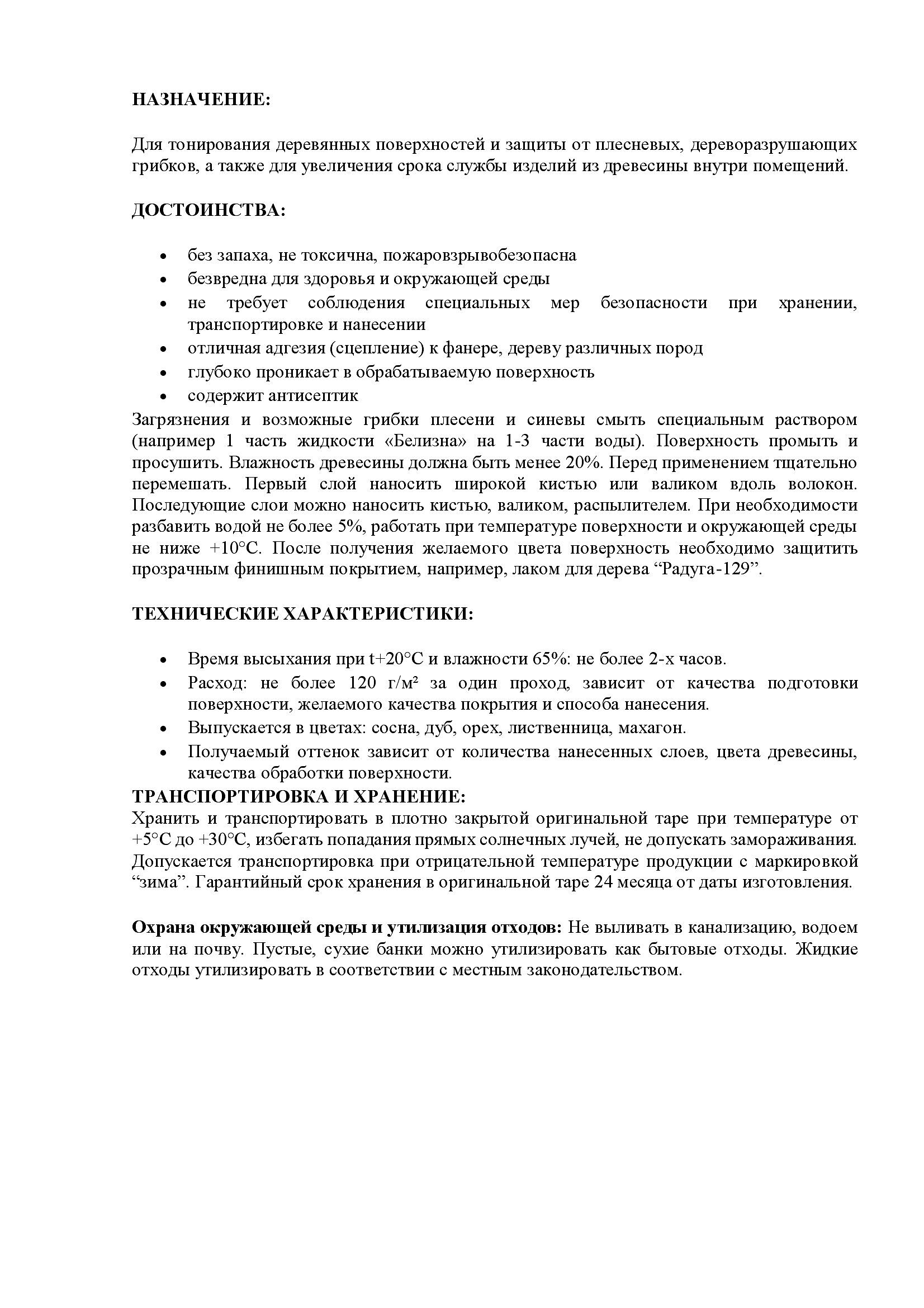 Морилка предназначена для тонирования и обработки древесины, защиты от плесени и дереворазрушающих грибков. Служит пропиткой для дерева. Увеличивает срок службы деревянных поверхностей (стены, потолки, двери, полы). Рекомендуется для бань, кроме парного помещения. Для внутренних работ.