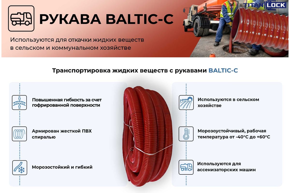 Гофрированный шланг из ПВХ BALTIC-C предназначен для откачки жидкостей, канализационных, сточных вод на ассенизаторских машинах, для подачи жидких веществ в сельском хозяйстве и коммунальном хозяйстве. Гофрированная поверхность обеспечивает гибкость и позволяет использовать рукав в условиях, где требуется сильный изгиб и мобильность. Особенностью шланга является морозостойкость до -40°С. Рабочая температура от -40°С до +60°С .