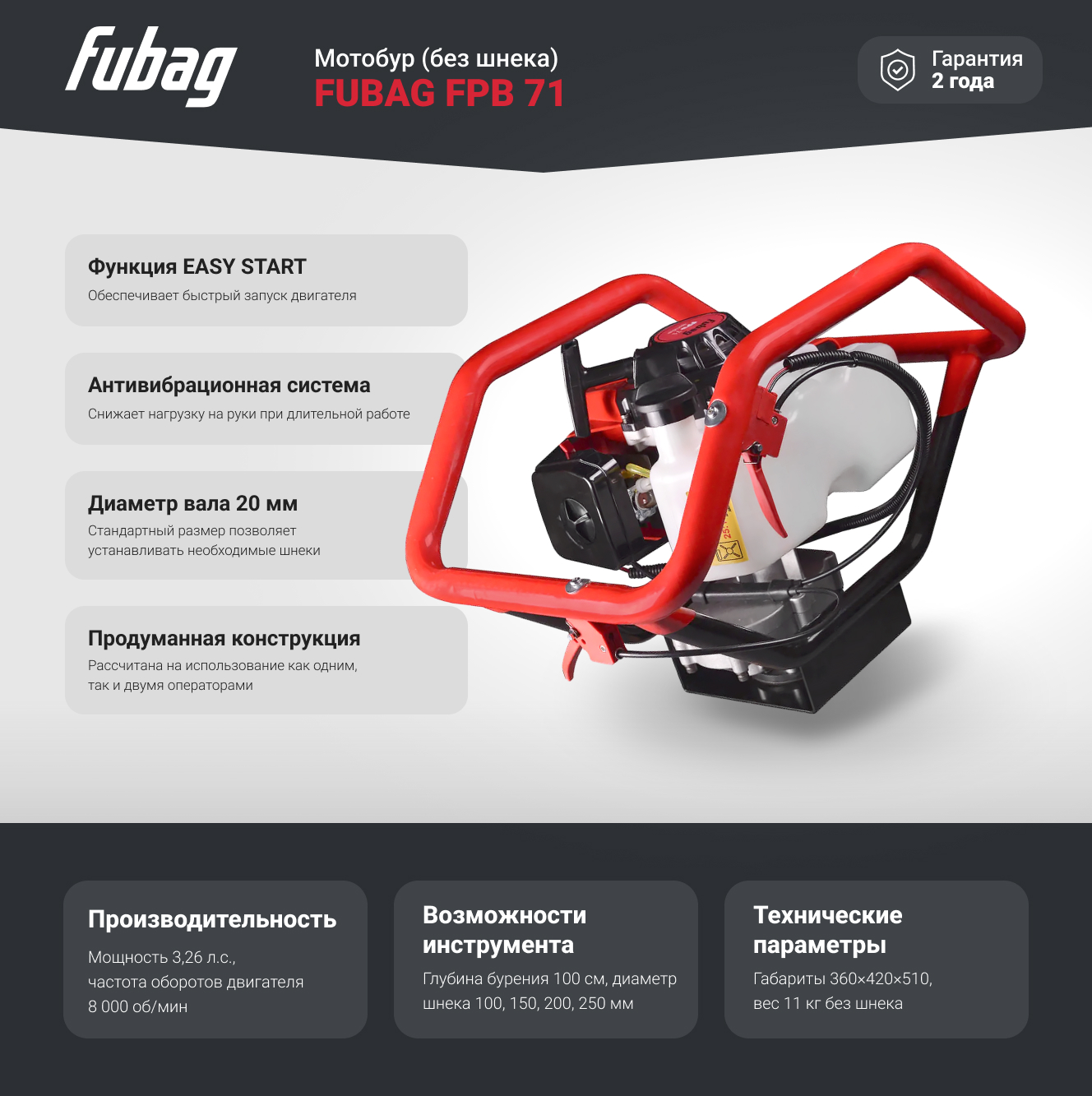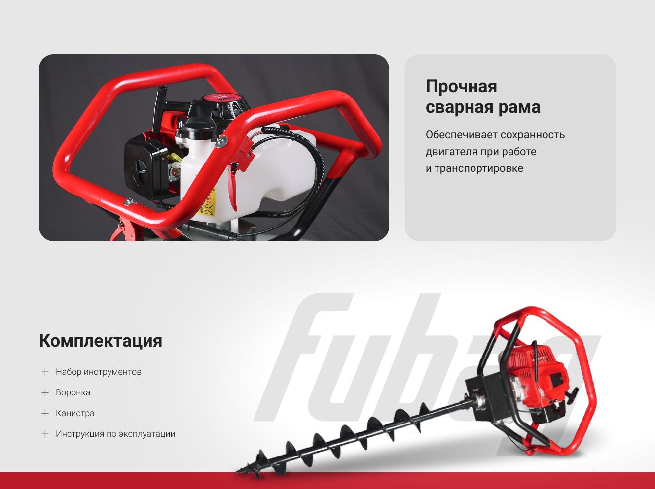Мотобур FUBAG FPB 71 без шнека 38273 оснащен прочным сварным каркасом, который кроме защиты двигателя от повреждений позволяет работать как одному, так и двум операторам. Мощный двухтактный двигатель обеспечивает быстрое и качественное бурение отверстий в твердых, мягких, мерзлых грунтах, а также во льду. Для контроля расхода топлива данная модель оснащена полупрозрачным баком.