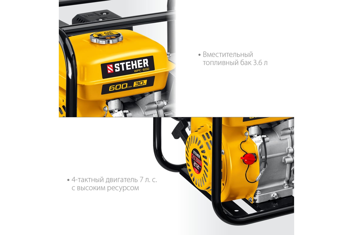 Бензиновая мотопомпа STEHER 600 л/мин WPC-600 - отличный помощник для перекачки воды из колодца или водоема, например, для полива. Незаменима для наполнения или смены воды в бассейнах и декоративных прудах. В период весеннего половодья при необходимости быстро откачает воду из подвальных помещений или погребов.