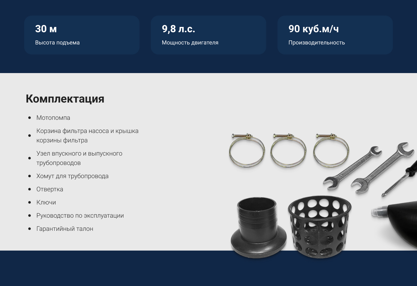 - Высокий рабочий ресурс обеспечивается за счёт того, что рабочее колесо и улита мотопомпы изготовлены из чугуна, торцовые уплотнения из карбида кремния