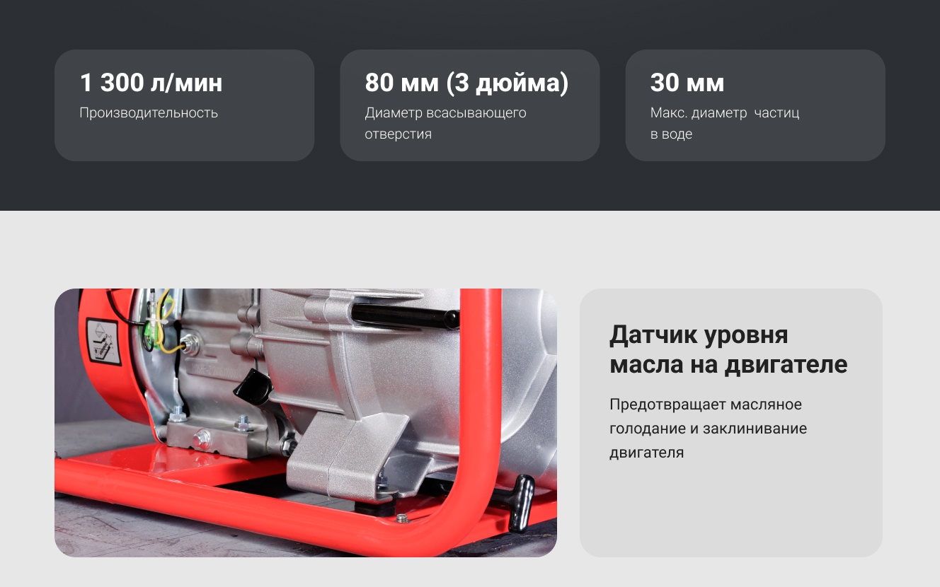 Эффективность 4-тактный двигатель мощностью в 7 л.с. способствует перекачке жидкости на расстояние до 26 м. |