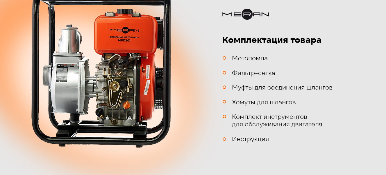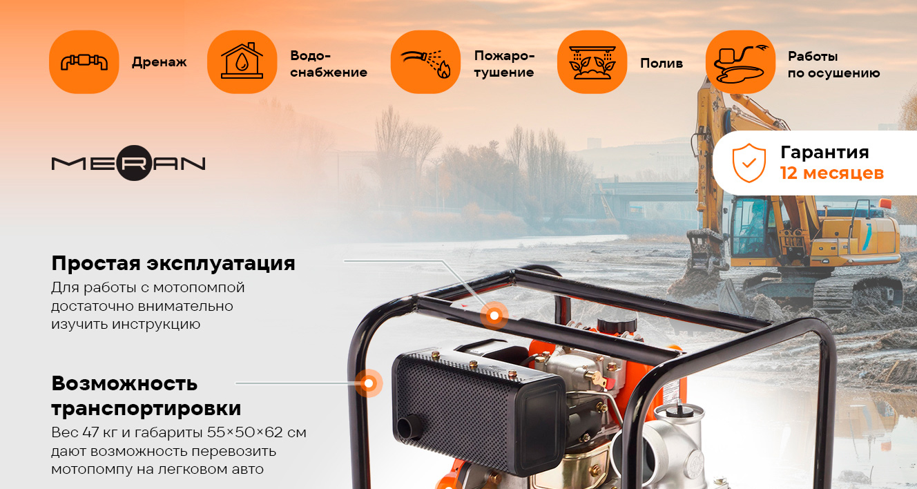 Мотопомпы MERAN являются надежным профессиональным оборудование и обеспечивают длительную и безотказную работу. Они успешно справляются с перекачкой воды различной степени загрязнения, что подтверждает их высокое качество. Область применения: дренаж, водоснабжение, пожаротушение, полив, осушение болот и котлованов.