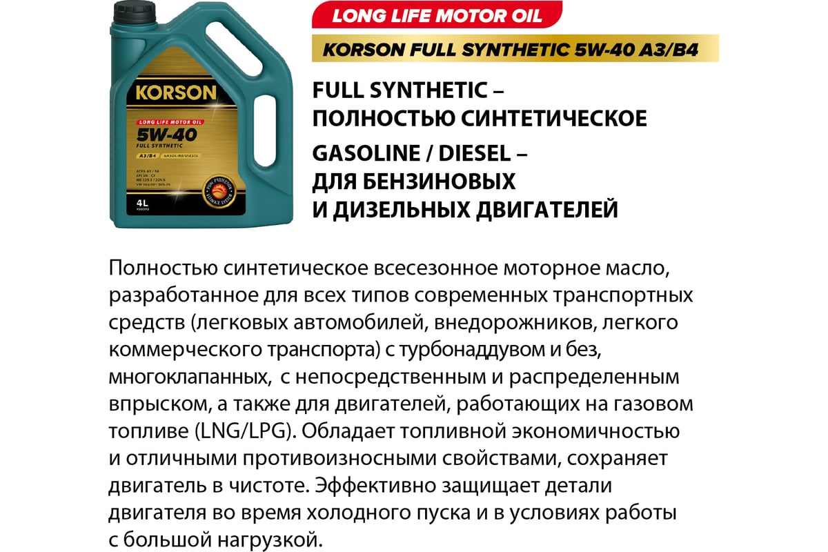Моторное масло KORSON 5W-40, синтетическое, 20 л KS00014