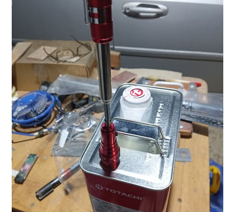 Жутко неудобный пластиковый язычок для налива масла из металлической канистры. Лучше выдвижной пластиковой воронки ещё не придумано.