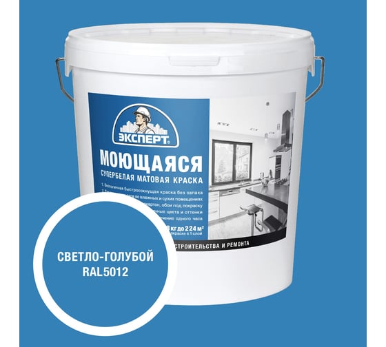 Краска моющаяся ЭКСПЕРТ цвет Светло-голубой 28 кг 34881 применяется для окраски стен и потолков в кухнях, ванных комнатах. Идеальна для структурных и стеклообоев. Обладает высокой степенью белизны и укрывистости. Очень хорошая стойкость к влажному истиранию. Очень экономичная в применении. Наносится на бетонные и оштукатуренные поверхности, гипсовые и гипсокартонные плиты, структурные и стеклообои.