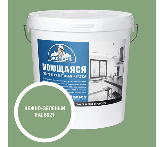 Краска моющаяся ЭКСПЕРТ цвет Нежно-зеленый 28 кг 34882 применяется для окраски стен и потолков в кухнях, ванных комнатах. Идеальна для структурных и стеклообоев. Обладает высокой степенью белизны и укрывистости. Очень хорошая стойкость к влажному истиранию. Очень экономичная в применении. Наносится на бетонные и оштукатуренные поверхности, гипсовые и гипсокартонные плиты, структурные и стеклообои.