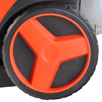 Для удобства перемещения мойки по участку предусмотрены два колеса и рукоятка.