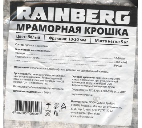 Мраморная крошка Rainberg фр. 10-20 мм, 5 кг 6098
