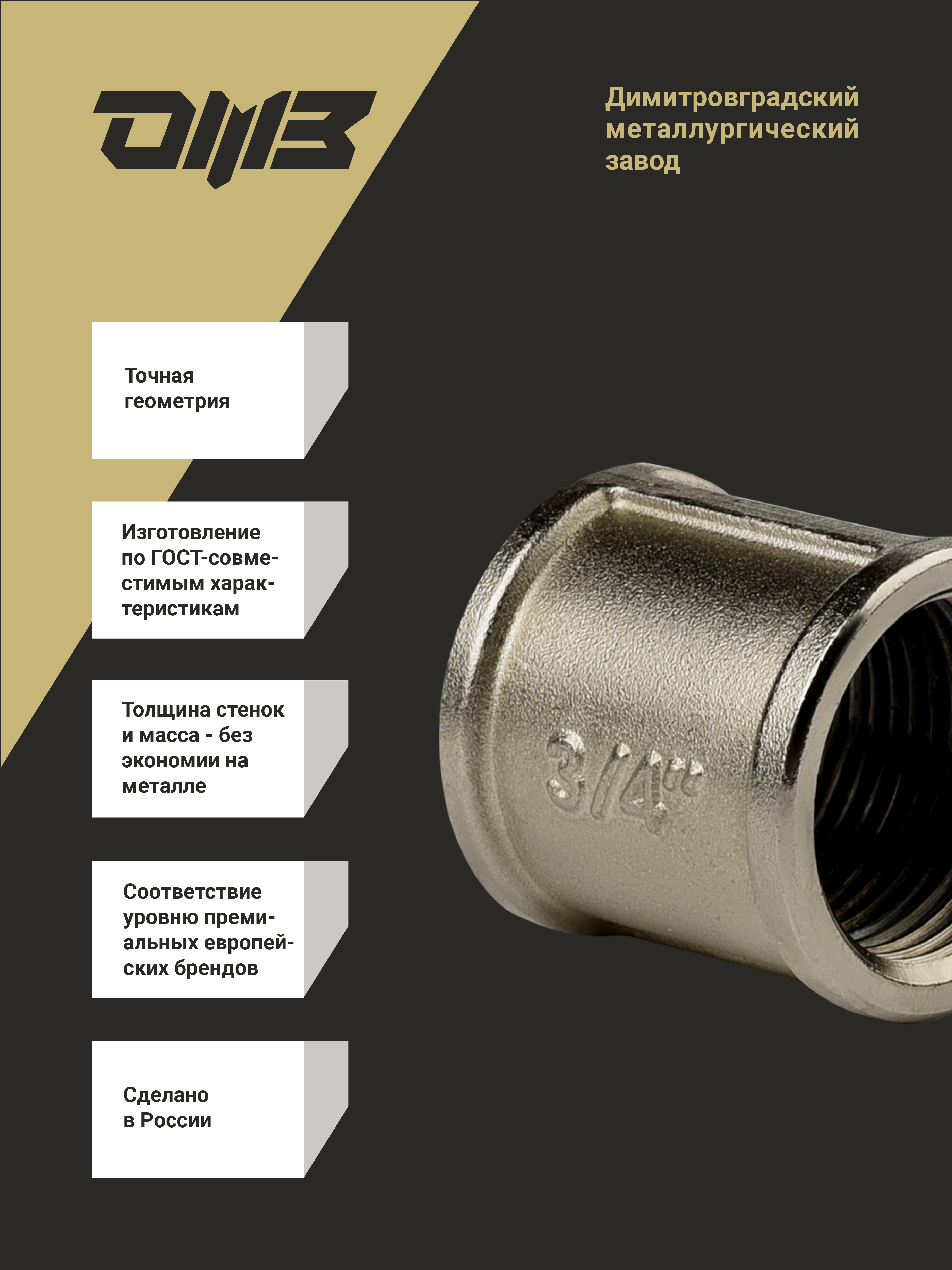 Высокая коррозионная стойкость — латунь устойчива к воздействию влаги и многих химических веществ, что увеличивает срок службы муфты.