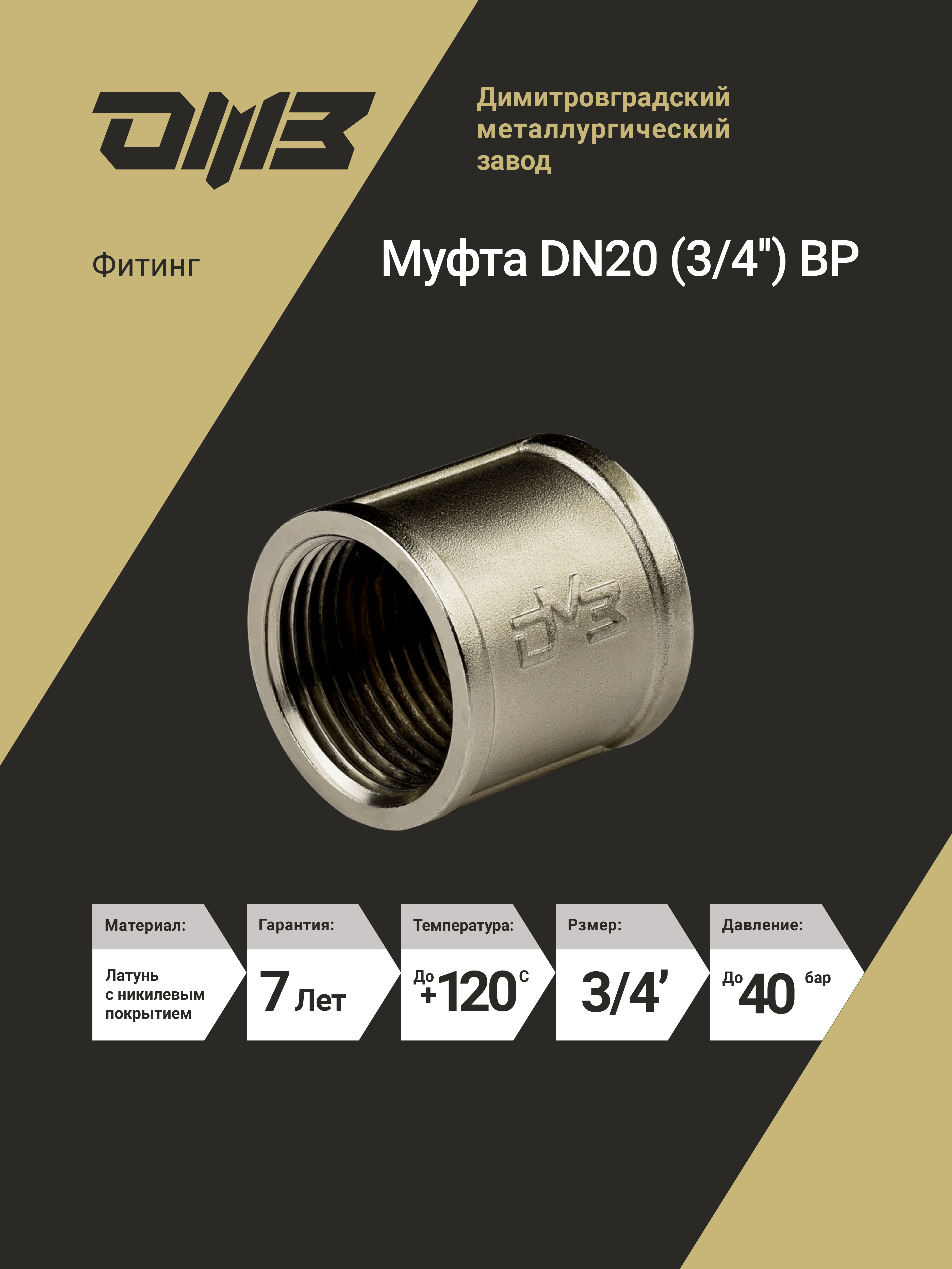 Муфта ДМЗ DN20 (3/4'') ВР латунь (упаковка 3 шт) ДМЗ.001.20