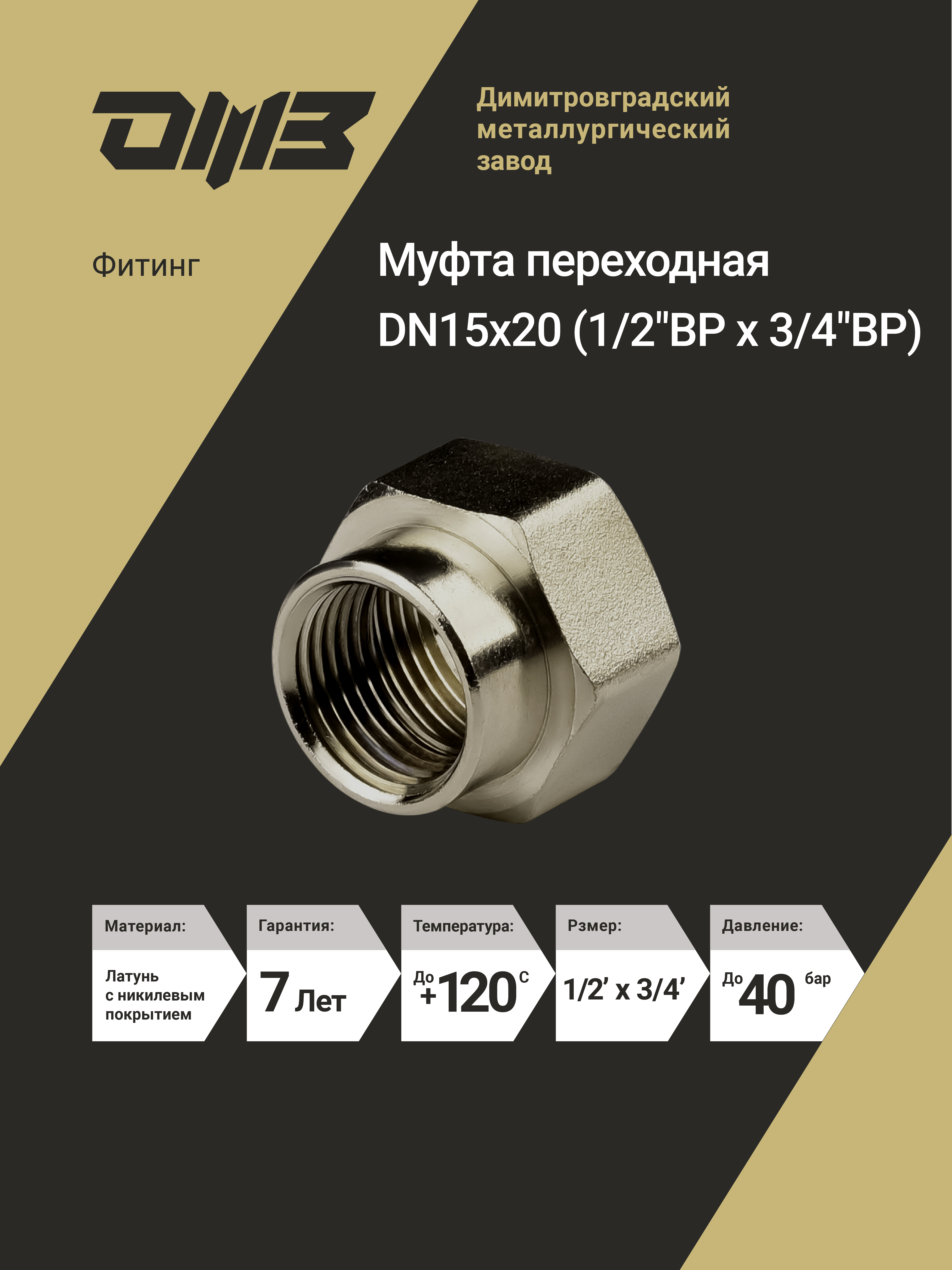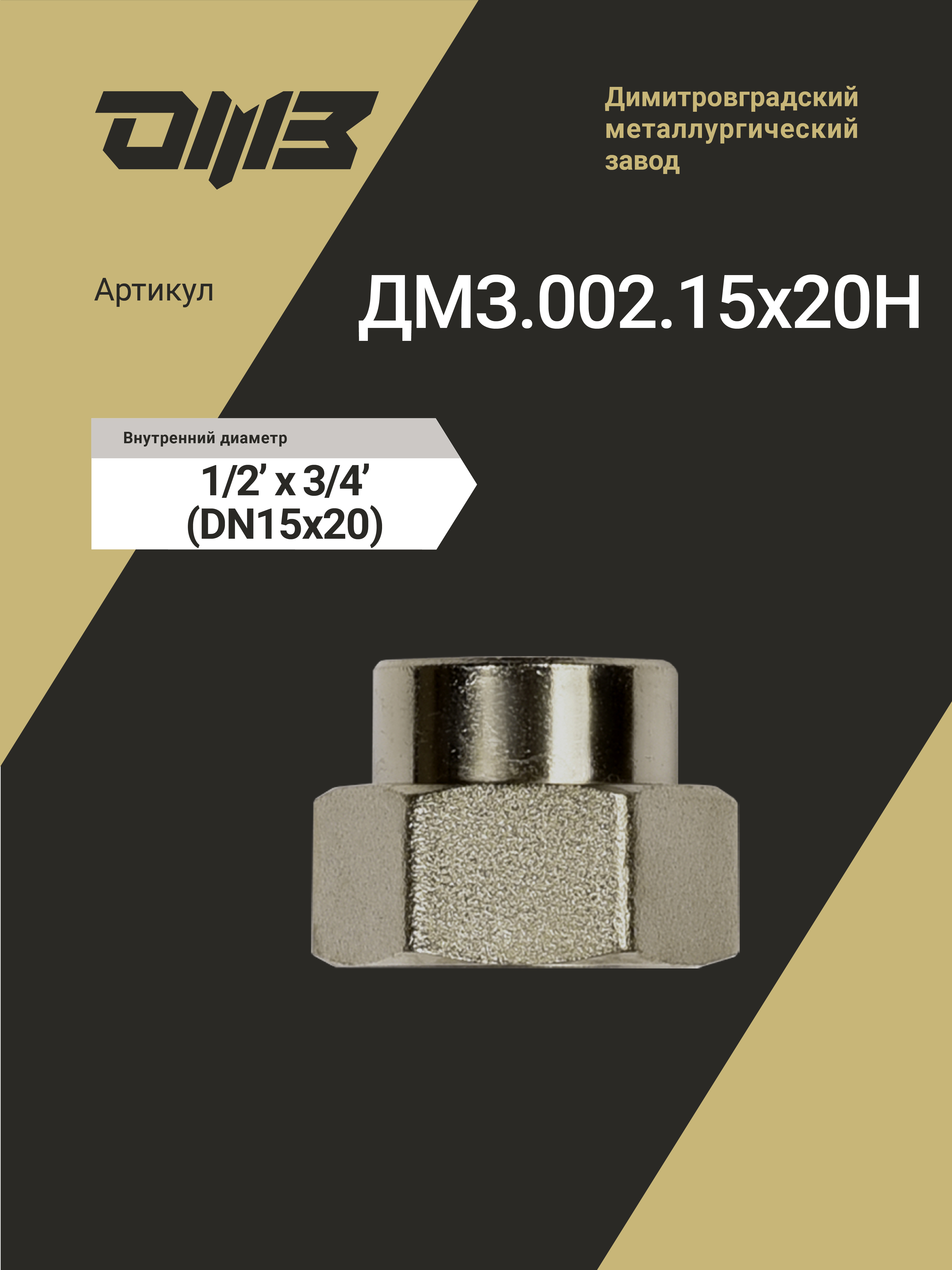 Муфта переходная ДМЗ DN15x20 (1/2"ВР х 3/4"ВР) латунь никель, 5 шт ДМЗ.002.15х20Н5