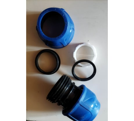 Корпус компрессионного фитинга TEBO technics отлит из черного полипропилена. Соединение накидной гайки и корпуса осуществляется при помощи трапециевидной резьбы, позволяющей выдерживать большие осевые нагрузки. Накидная гайка произведена из полипропилена синего цвета, который имеет высокую прочность. Уплотнительное кольцо круглого сечения изготовлено из бутадиен-нитрильного каучука (NBR) обеспечивает герметичное соединение ПЭ трубы с корпусом фитинга. Запрессовывающая втулка из полипропилена удерживает уплотнительное кольцо в фиксированном положении. Разрезное зажимное кольцо отлито из полиацэталя — материала, который обладает более высокой твердостью, чем полиэтилен. Благодаря специальному профилю внутренней поверхности, зажимное кольцо предотвращает выдавливание полиэтиленовой трубы из корпуса внутренним давлением воды.