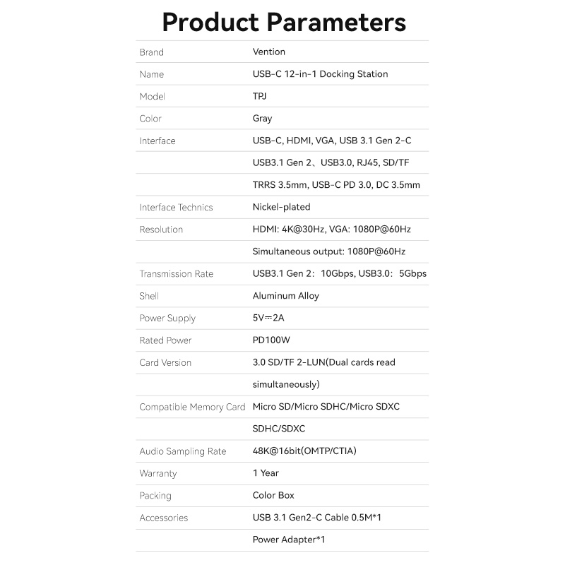 Дополнительные технические характеристики мультифункциональной док-станции VENTION USB Type C 12 в 1 TPJH0-EU: