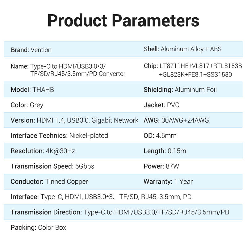 Мультифункциональный хаб, позволяет увеличить количество разъемов на вашем устройстве с разъемом USB Type C. Максимальный объем считывания карт памяти до 256 Гб. Поддерживает стандарт IEEE 802.3x Flow Control (Управление потоком). Хаб позволяет добавить внешний сетевой разъем RJ45 на оборудовании с разъемом USB, для Ethernet-сетей со стандартами 10BASE-T (10 Мбит/сек), 100BASE-T(x) (100 Мбит/сек), 1000BASE-T(x) (1 Гбит/сек). Также благодаря 3 разъемам USB 3.0, одновременно можно подключать, или заряжать до 3 устройств на оборудовании с разъемом USB Type C. Разъем Jack 3.5 mm обеспечит подключение аудио аксессуаров к например Macbook, а разъем HDMI передаст аудио/видео контент на проектор или монитор. Разъем USB Type C можно использовать для зарядки устройств. Поддерживает технологию Plug and Play, тем самым, не требуя установки дополнительного программного обеспечения и драйверов.