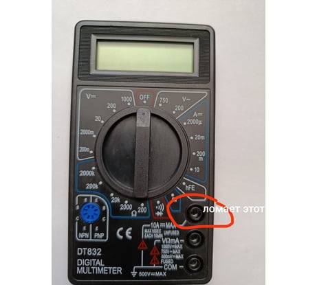 При подключение щупа в первый разъем, щуп приходится подключать с усилием так как разъем на щупе чуть шире что ведет за собой слом платы где распаяны разъемы на самом мультиметре. слом происходит из-за не правильного расположения упоров.