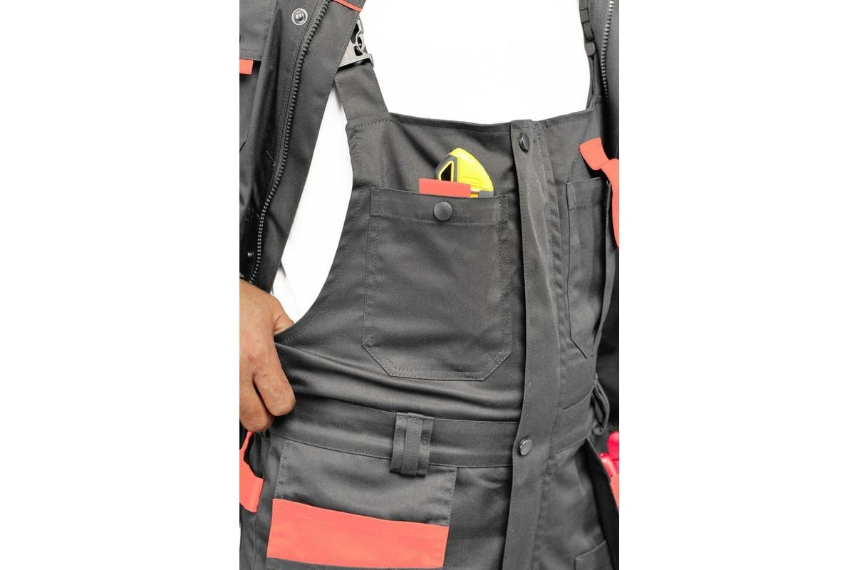 Полукомбинезон с высокими грудкой и спинкой. Бретели оснащены вставками из резинки, регулируются по длине и застегиваются на фастексы. По линии талии имеются двойные шлевки под ремень. На полукомбинезоне множество функциональных карманов: накладные и навесные. В районе коленей имеются усиления со входом под амортизационные вставки.