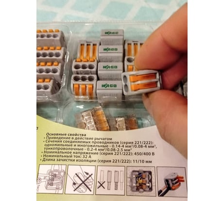 Отличное решение для быстрого монтажа. На каждой клемме есть пометки (ампер, вольтаж, длина зачистки и сечение жилы). Не используйте клеммы Wago для нагрузочных соединений и соединений в коробках, установленых в помещениях с повышенной влажностью (применяйте специальные коробки с повышенной влагозащищённостью).