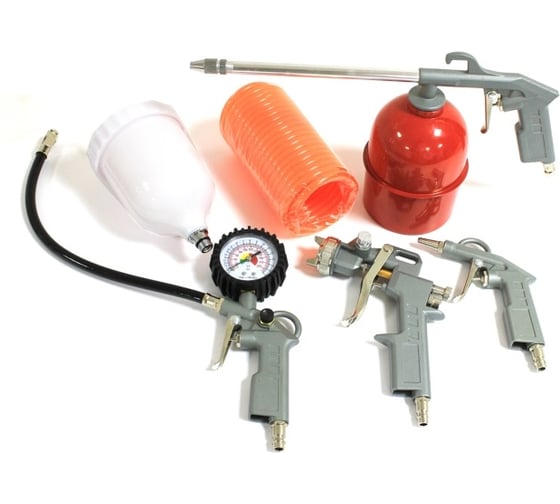 Набор окрасочного пневмоинструмента из 5 предметов для нанесения лакокрасочных материалов, очистки сильно загрязненных деталей сухой и влажной продувкой. Инструменты снабжены быстросъёмным соединением. Подходит для всех типов краски.