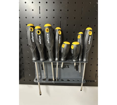 Набор аксессуаров для перфопанели ООО Металекс Metalex серый ACNPRS предназначен для компактного размещения рабочего инструмента. Включает: