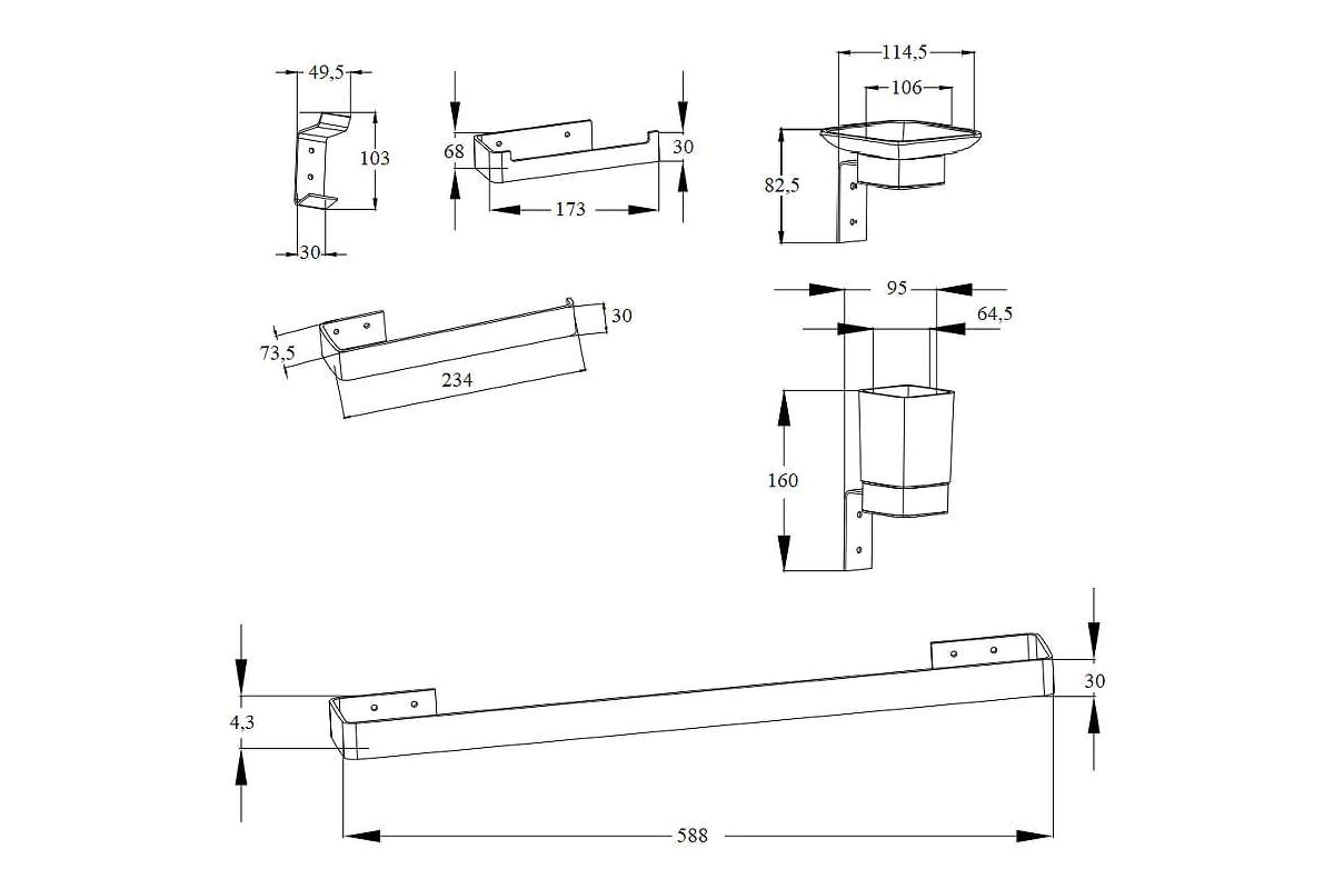 Состав набора:полотенцедержатель, бумагодержатель, мыльница, стакан, крючок