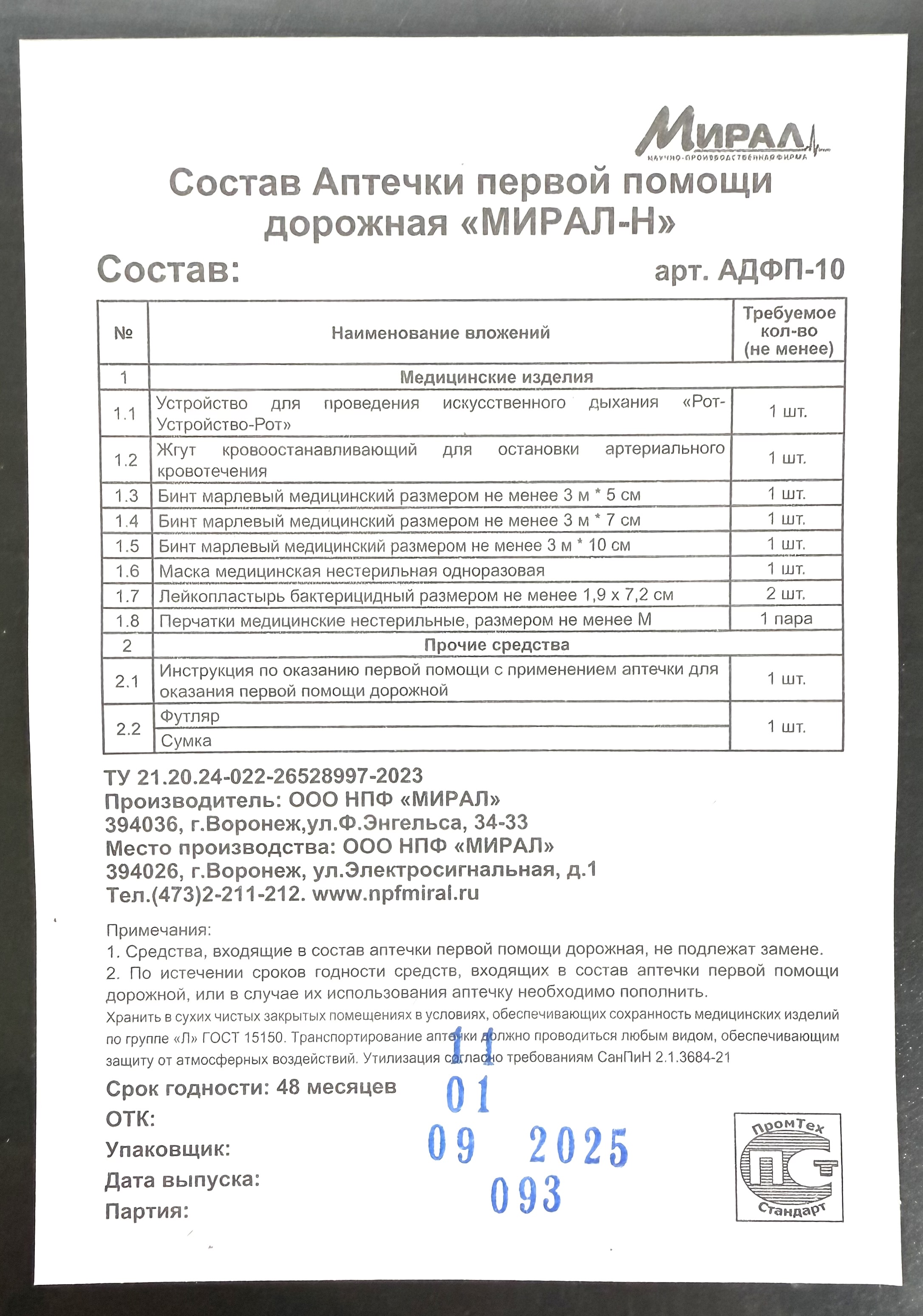 Комплектация позволяет оказать первую помощь при ДТП и успешно пройти техосмотр автомобиля.