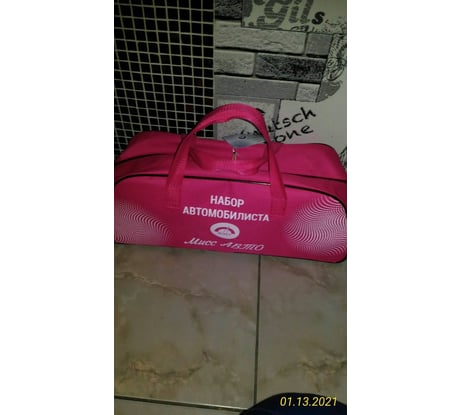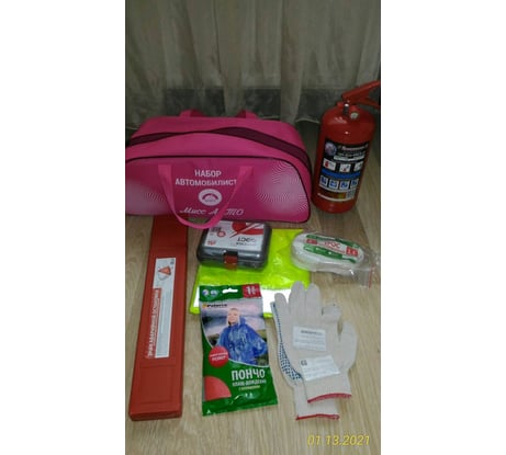 Отличная сумочка, с липучкой на тыльной стороне, держится в багажнике намертво. Комплект бъёт по списку: сумочка, знак Ав.Ост., огнетушитель, аптечка мини, перчатки х/б, жилет светоотражающий, дождевик (мелочь, а приятно), трос буксировочный на 3.5 т.(заявлено производителем) белого цвета... Супруга довольна набором, и я спокоен! Осталось прикупить хороший дамский розового цвета компрессор и я, молодец!))) Да в аптечку бросить пару масок и пару перчаток (согласно изменениям ПДД (как уже достали..)) Данный набор конечно дороговато из за сумочки, но! Могли бы компрессор вложить уж для полного счастья! В целом, данный набор рекомендую к покупке.