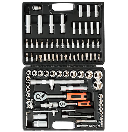 - Только самое нужное В наборе трещоточный и шестигранные ключи, головки и воротки, удлинители, свечные головки