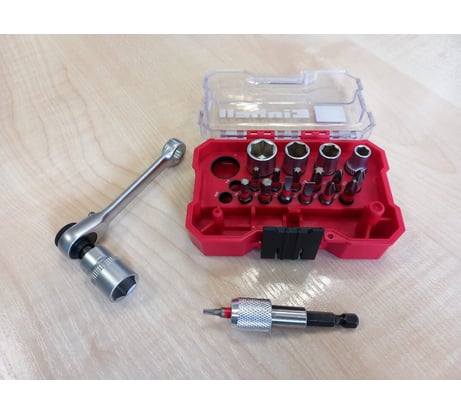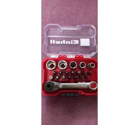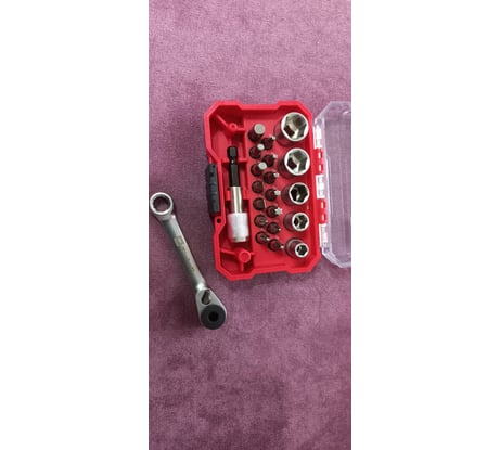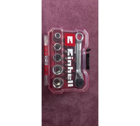 Набор бит и головок Einhell битодержатель, ключ реверсивный, xs-case, 21 предмет 118683 купил во Всеинструменты.ру 01.04.2025 за 1586 рублей (заказ №2503-244197-92541). Пластиковый кейс добротный, надежный, размером 11×7,5×3,5 см (Д×Ш×В), клипса с плотной фиксацией. В ложементе кейса посадочные отверстия с резиновым кольцом. Оснастка при тряске и переворочивании кейса может выпасть (головки и ключ). Реверсивный ключ очень компактный, имеет трещотку 1/4" с одной стороны, а с другой - накидную 12-гранную часть на 8 мм. Флажок реверса на ключе плотно переключается. Очень удобно, что при малом ходе можно за счёт зубчатого кольца на трещотке доворачивать крепёж. Также в комплекте есть нужный переходник с шестигранника 1/4" на квадрат 1/4". Из оснастки в комплекте ходовые биты с 6-гранным хвостовиком 1/4" (13 шт: Н, SL, PH, T, PZ) и головки (5 шт: 6; 8; 10; 12; 13 мм). От попадания влаги на битах появились точки ржавчины (берегите от воды!). К сожалению, только битодержатель с магнитом, а сами биты не имеют магнитных наконечников. В целом, набор оснастки годный, рекомендую (особенно из-за кейса и трещоточного ключа!)