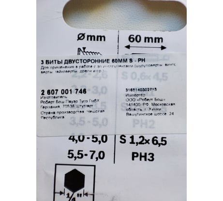 Отзывы о наборе бит (PH/SL; 60 мм; 3 шт.) Bosch 2607001746