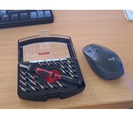 Относительно компактный набор с эргономической рукояткой отвёртки и удобным кейсом, со всеми необходимыми битами, не металлическое исполнение (чисто субъективно)
