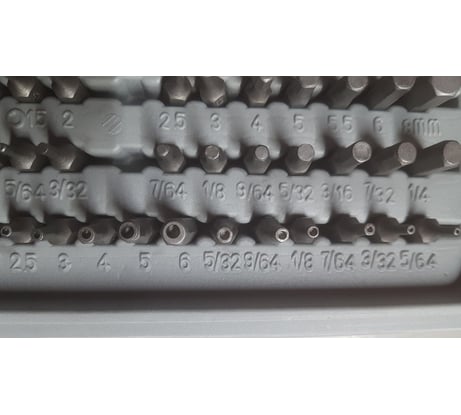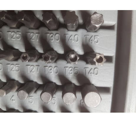 - Набор бит 1/4" х 25 мм: PH 0, 1, 2 - 5 шт., 3; PZ 0, 1, 2 - 5 шт., 3; ROBERTSON 0, 1, 2, 3; DOUBLE PIN (spanner) 4, 6, 8, 10; SL 3, 4, 4.5, 5, 5.5, 6, 6.5, 7, 8; TORX 8, 10, 15, 20, 25, 27, 30, 40, 45; ТORX Hole 8, 10, 15, 20, 25, 27, 30, 35, 40; HEX 1.5, 2, 2.5, 3, 4, 5, 5.5, 6, 8; HEX SAE 1/16", 5/64", 3/32", 7/64", 1/8", 9/64", 5/32", 3/16", 7/32", 1/4"; HEX Hole 2, 2.5, 3, 4, 5, 6; HEX Hole SAE 5/64", 3/32", 7/64", 1/8", 9/64", 5/32"; SPLINE 5, 6, 8; CLUTCH 1, 2, 3; TORQ-SET 6, 8; TRIWING 1, 2, 3, 4; бита для крюков.