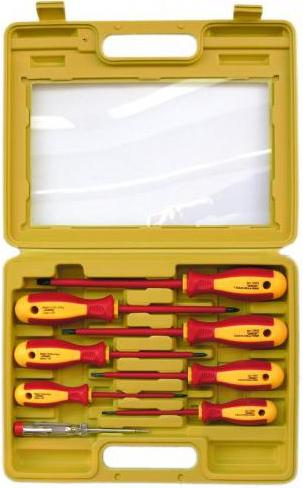 Набор диэлектрических отверток 8шт Энкор 19835 - это незаменимый электротехнический комплект изолированных отверток, который сочетает в себе 4 отвертки с прямым шлицем, 3 крестовые отвертки и 1 отвертку пробник. Данные инструменты предназначены для работ с крепежами, находящимися под напряжением до 1000 В.