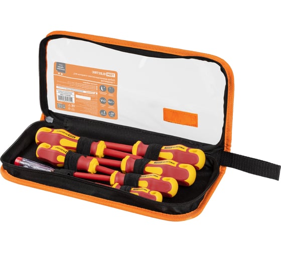 Набор диэлектрических отверток №2 от TDM Electric - это профессиональный инструмент, который предназначен для проведения слесарных и электромонтажных работ под напряжением до 1000 В. В комплект входят 7 предметов, упакованных в удобный тканевый пенал красного цвета.Особенностью данного набора является его функциональность. Намагниченный наконечник отверток позволяет удерживать крепеж, что значительно упрощает процесс работы.Двухкомпонентная рукоятка отверток выполнена из термопластичной резины TPR и ПВХ. Это обеспечивает удобство и комфорт при длительной работе, предотвращая усталость и обеспечивая надежное сцепление с рукой.Изоляционное диэлектрическое покрытие отверток гарантирует безопасность при работе в местах под напряжением до 1000 В. Материалы, из которых изготовлены инструменты, - сталь Cr-V для стержня и ПВХ для рукоятки - обеспечивают прочность и долговечность.В комплекте с набором диэлектрических отверток №2 "ПрофиЭлектрик" от TDM Electric вы получаете не только инструменты, но и удобный тканевый пенал для их хранения. Это позволяет всегда иметь под рукой все необходимые инструменты и обеспечивает их безопасное хранение.Выбирая набор диэлектрических отверток №2 "ПрофиЭлектрик" от TDM Electric, вы получаете надежный и удобный инструмент для проведения слесарных и электромонтажных работ под напряжением до 1000 В.