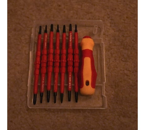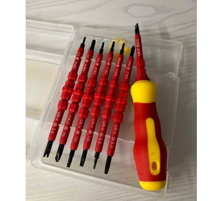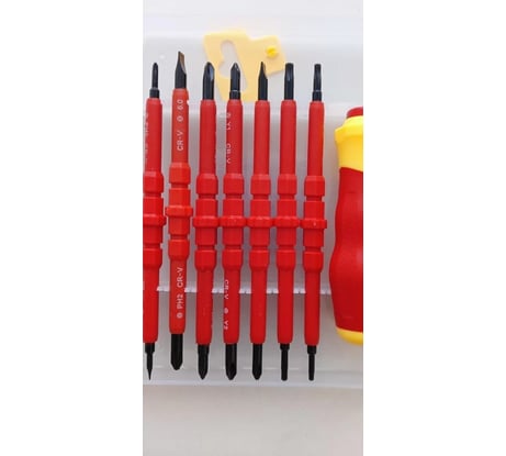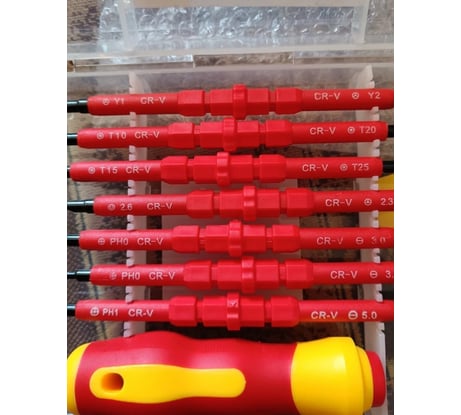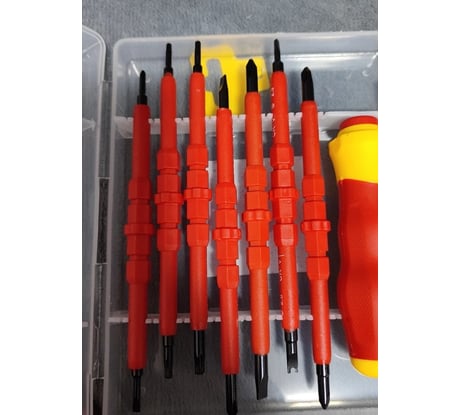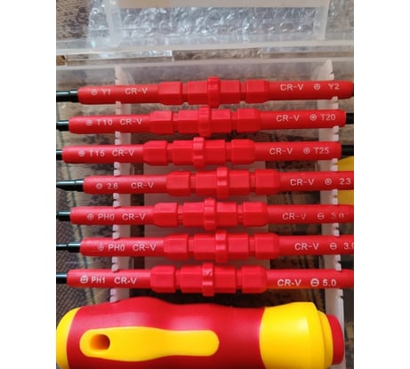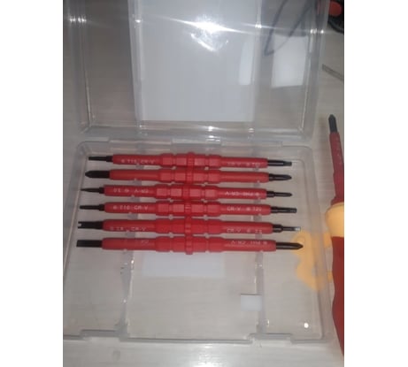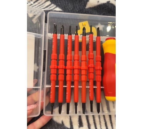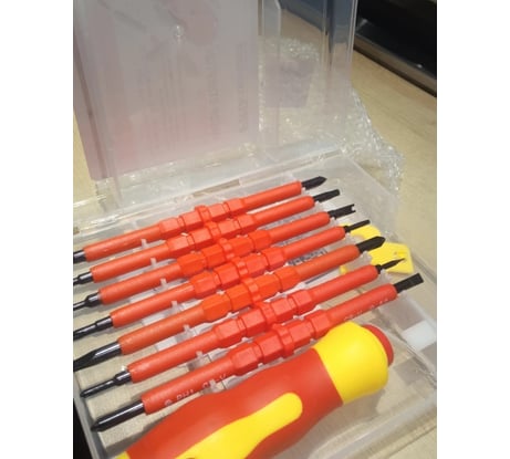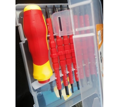 Все жала точно калиброваны, плотно входят в шлицы без люфта. Диэлектрическое покрытие проверено — соответствует заявленным характеристикам. Особенно радует продуманный кейс, где каждый инструмент надежно зафиксирован