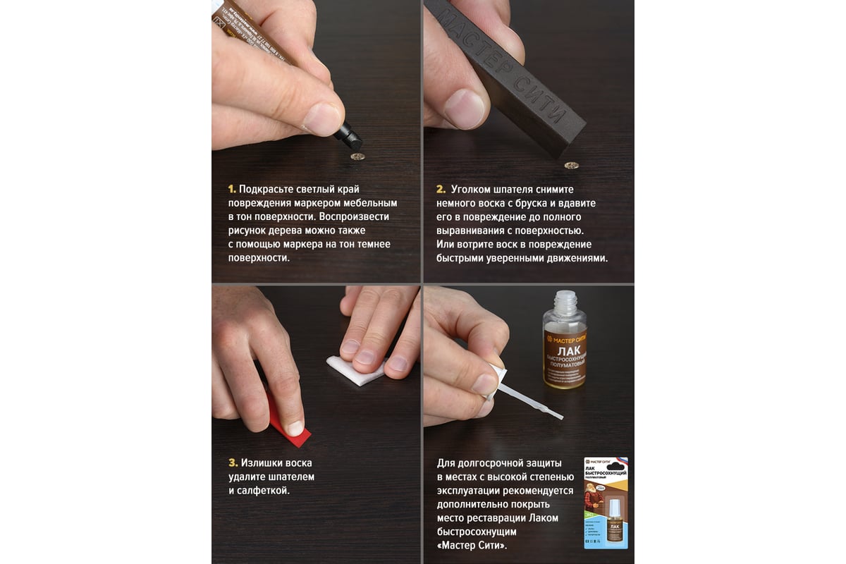 Набор для домашнего ремонта и реставрации мебели от ведущего российского производителя Мастер Сити. Набор из мебельного штриха, маркера и воска легок в использовании, маскирует повреждения, обновляет и улучшает внешний вид мебели. С помощью мягкого мебельного воска, мебельного штриха и маркера можно устранить повреждения на ЛДСП, МДФ, массиве дерева, пластике. Мебельным маркером и штрихом закрашивайте неглубокие царапины, воском для мебели устраняйте средние и глубокие повреждения. Используйте набор для ремонта повреждений на столах и другой мебели, дверях, плинтусах, окнах, подоконниках, ламинате и других покрытиях, где нет интенсивной нагрузки. Для ремонта собраны продукты максимально близких оттенков для точного попадания в цвет одного или нескольких изделий в одной цветовой гамме. Вы можете каждый из них использовать отдельно или вместе для достижения наилучшего результата. В комплекте шпатель для заделки мягким воском. Подробную инструкцию читайте на упаковке.
